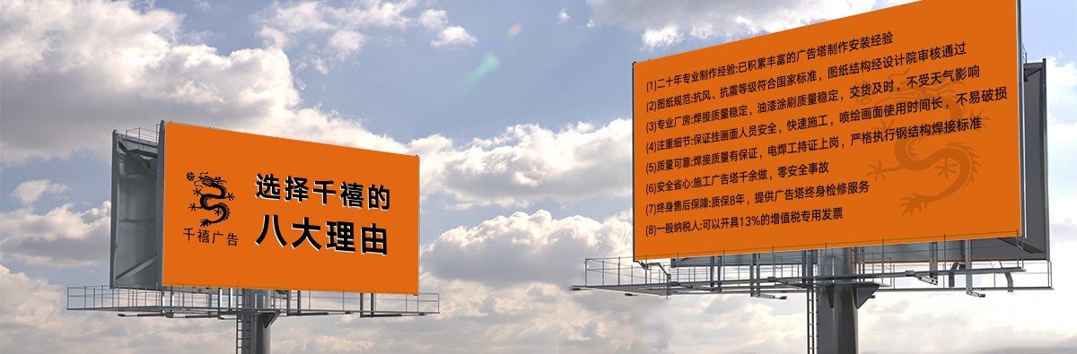 世紀之交,石家莊千禧廣告裝飾有限公司(下方簡稱千禧廣告公司或公司)自2000年10月10日創(chuàng)立伊始,即在燕趙大地落地生根,成長為國內(nèi)擁有23年施工經(jīng)驗的實體型戶外廣告設(shè)施制作工廠。公司集新品研發(fā)、結(jié)構(gòu)設(shè)計、生產(chǎn)制作、施工建造于一體,現(xiàn)代化生產(chǎn)廠房為大中型高炮廣告牌(又稱高炮廣告塔、單立柱廣告牌、單立柱廣告塔、擎天柱廣告塔、擎天柱廣告牌)、龍門架、三面翻鋼結(jié)構(gòu)、LED廣告屏鋼結(jié)構(gòu)等的精益生產(chǎn)、高效流水化作業(yè),產(chǎn)品交工質(zhì)量過硬,公司擁有現(xiàn)代化生產(chǎn)車間,配備了不可或缺的硬件裝備。